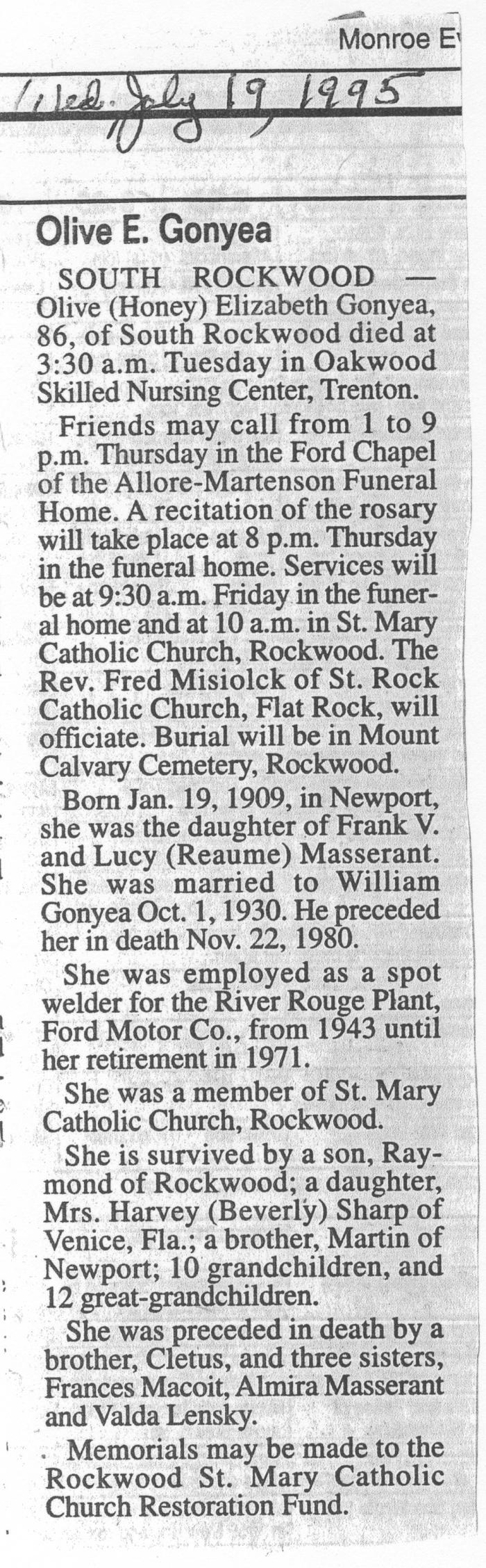 Obituary of Olive E. Gonyea born Jan.9, 1909 in Newport, Michigan. Resided in South Rockwood, Michigan.