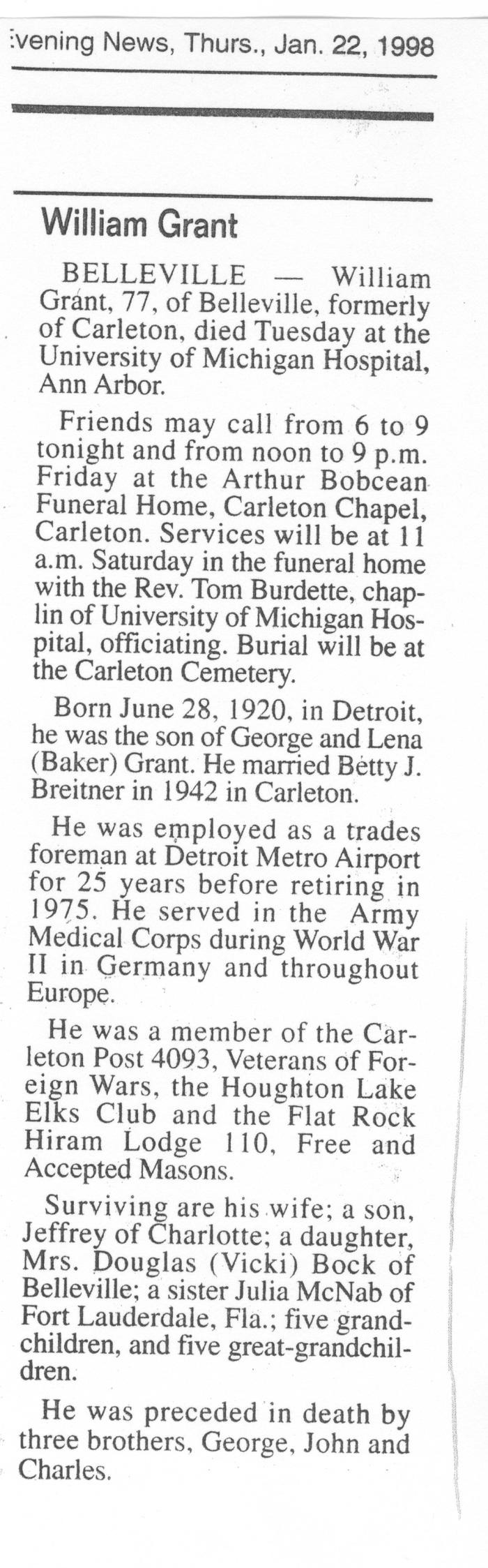 Obituary of William Grant born June 20, 1920 in Detroit, Michigan. Resided in Belleville and Carleton, Michigan.