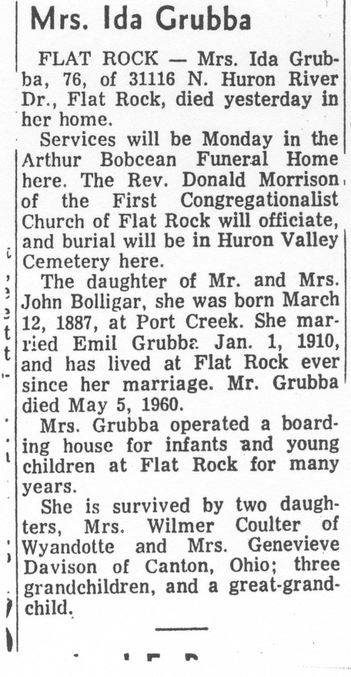 Obituary of Mrs. Ida Grubba born March 12, 1887 in Port Creek, Michigan. Resided in Flat Rock, Michigan.