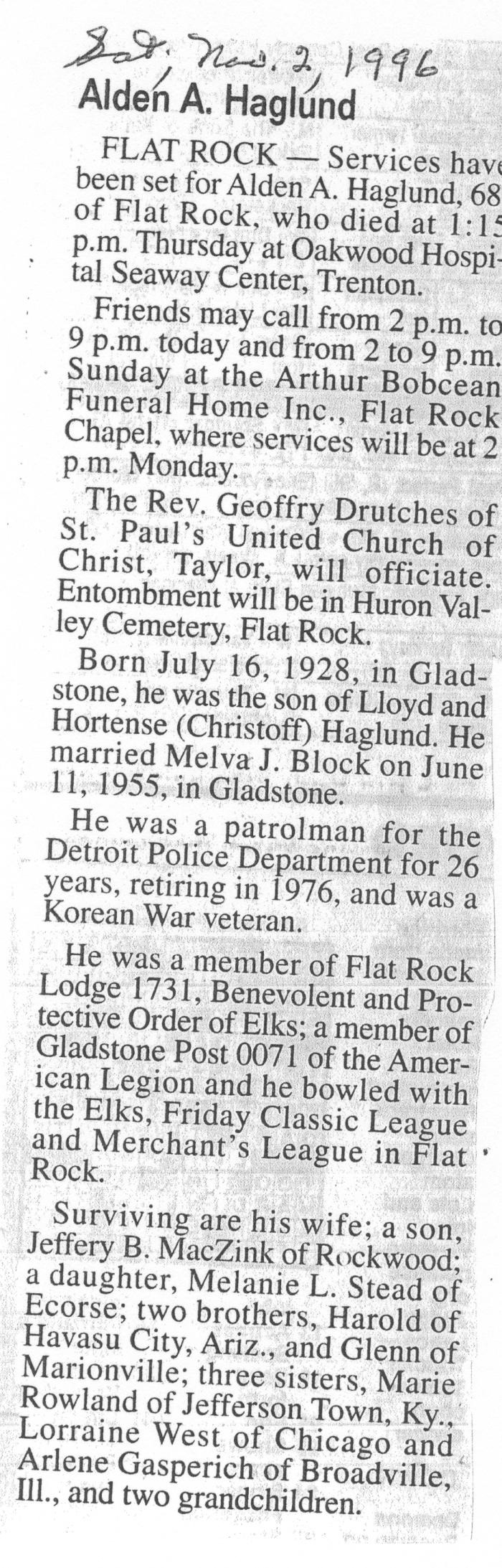 Obituary of Alden A. Haglund born July 16, 1928 in Gladstone, Michigan. Resided in Flat Rock, Michigan.