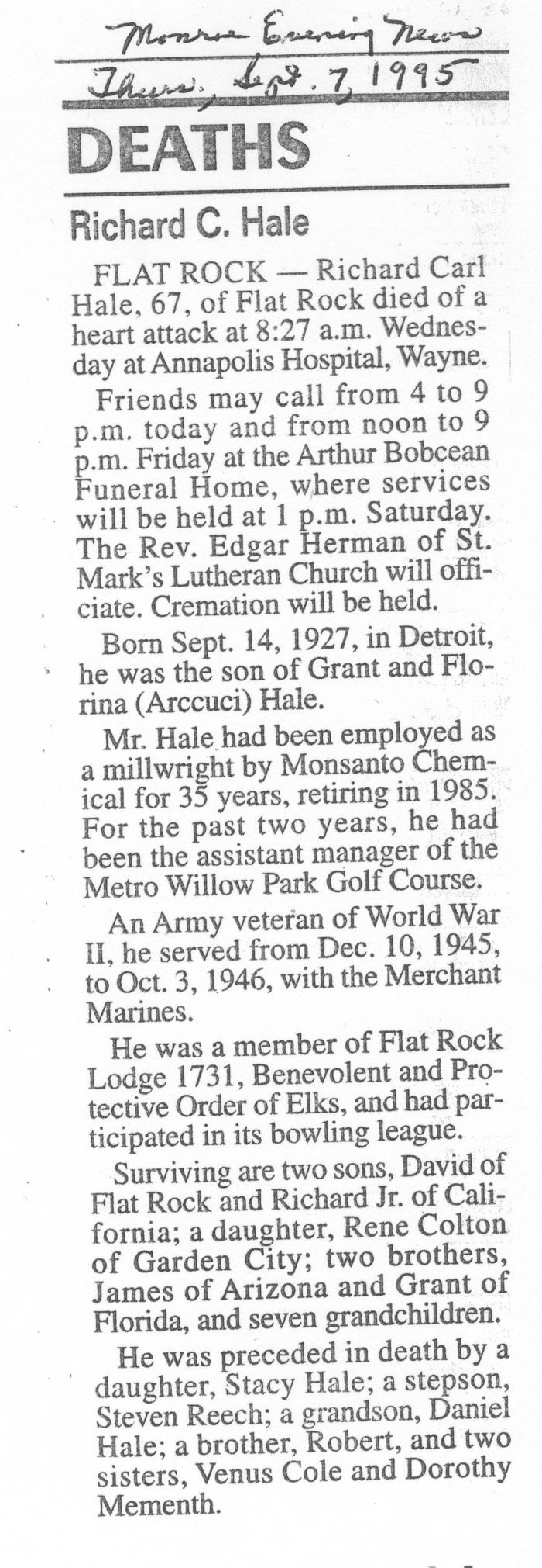 Obituary of Richard Carl Hale born Sept. 14, 1927 in Detroit, Michigan. Resided in Flat Rock, Michigan.