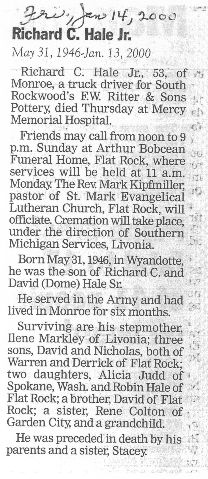 Obituary of Richard C. Hale Jr. born May 31, 1946 in Wyandotte, Michigan. Resided in Monroe, Michigan.