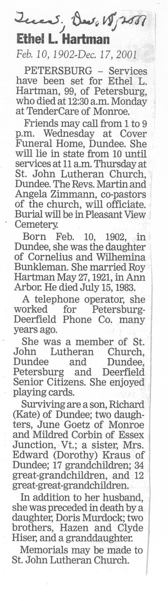 Obituary of Ethel L. Hartman born Feb.10, 1902 in Dundee, Michigan. Resided in Petersburg, Michigan.