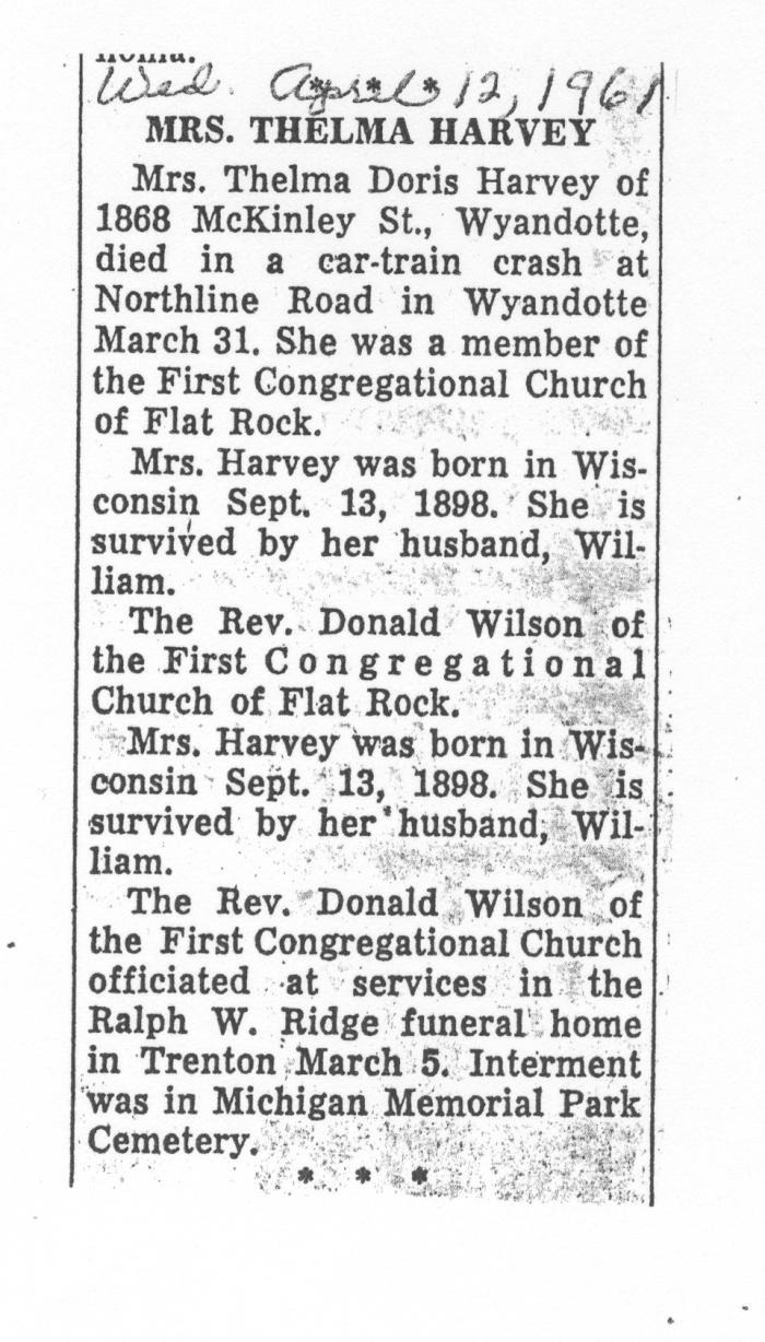 Obituary of Mrs. Thelma Harvey born Sept. 13, 1898 in Wisconsin. Resided in Wyandotte, Michigan.
