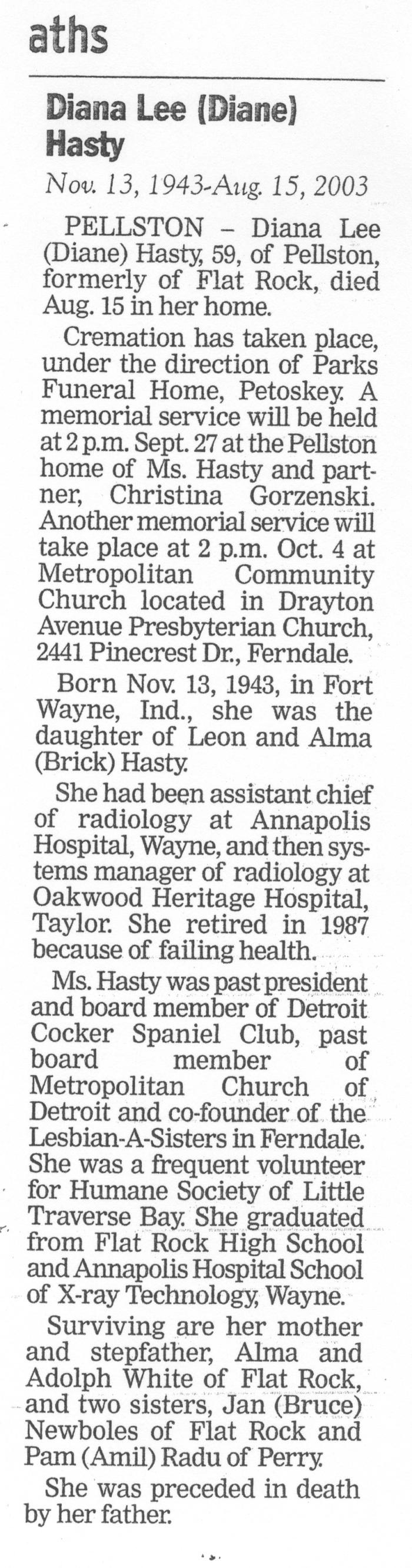 Obituary of Diana Lee (Diane) Hasty born Nov.13, 1943 in Fort Wayne, Indiana. Resided in Flat Rock and Pellston Michigan.