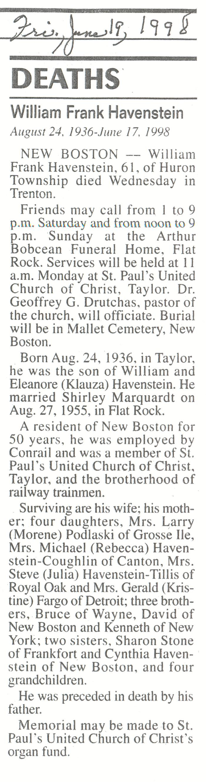 Obituary of William Frank Havenstein born Aug. 24, 1936 in Taylor, Michigan. Resided in Huron Township, Michigan.