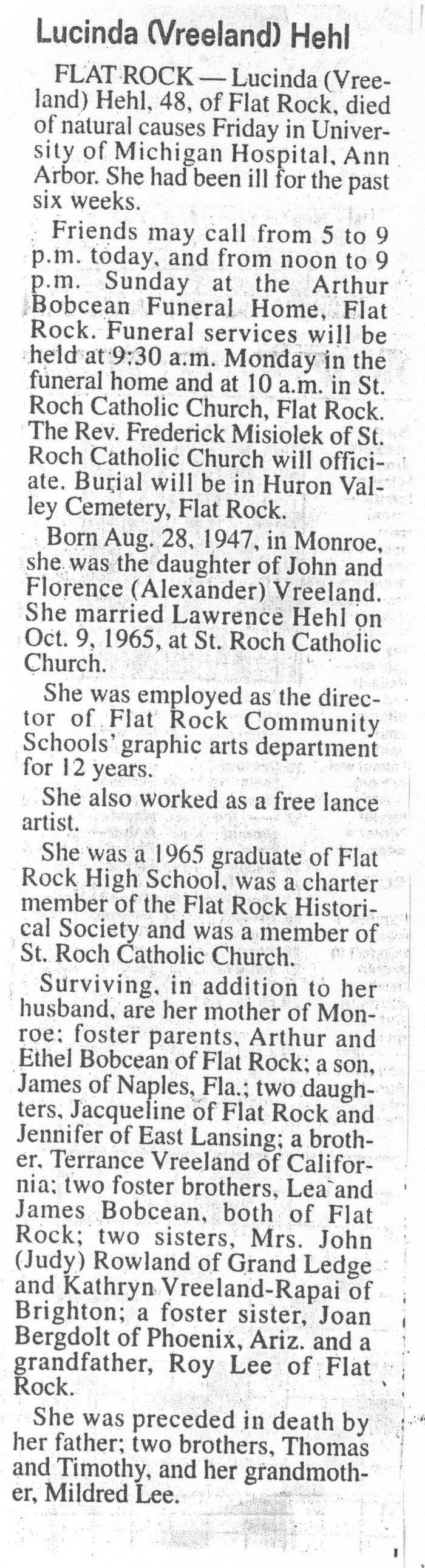 Obituary of Lucinda (Vreeland) Hehl born Aug. 28, 1947 in Monroe, Michigan. Resided in Flat Rock, Michigan.