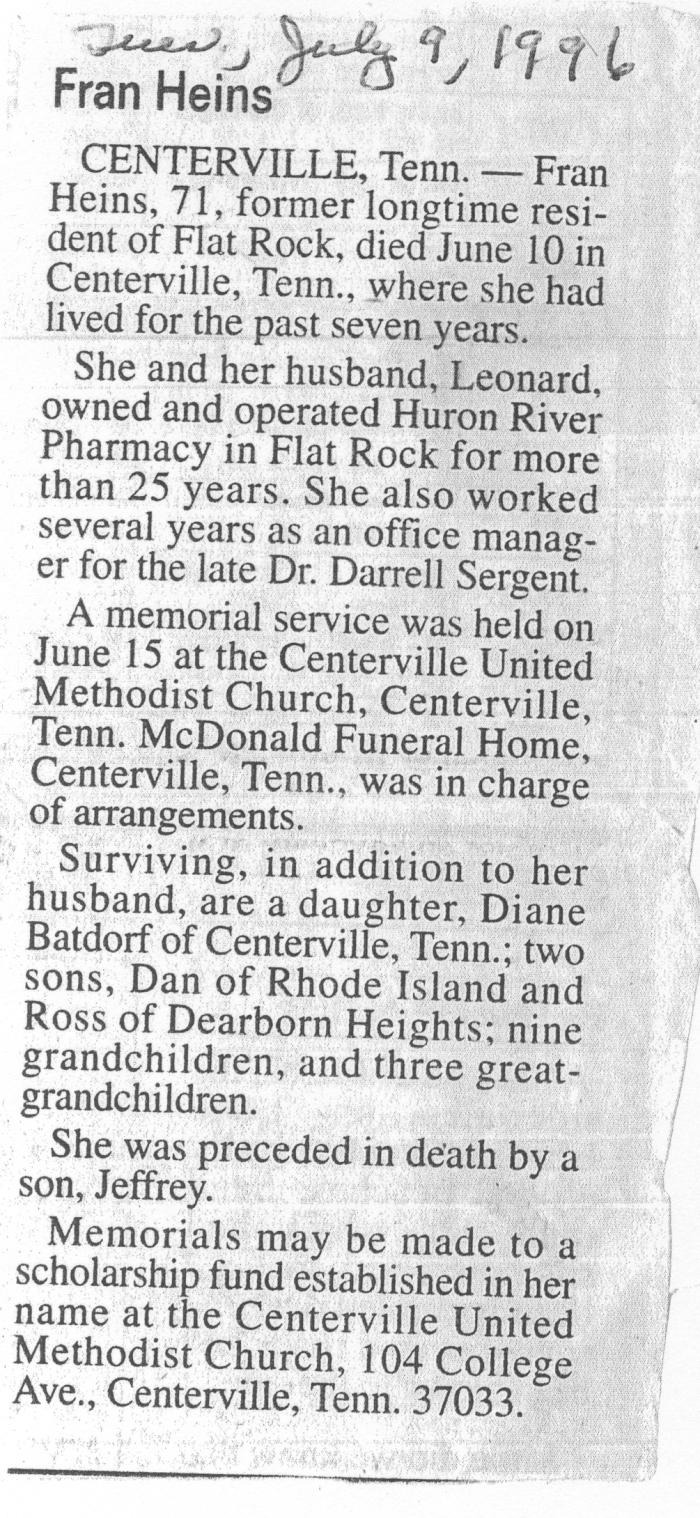 Obituary of Fran Heins.