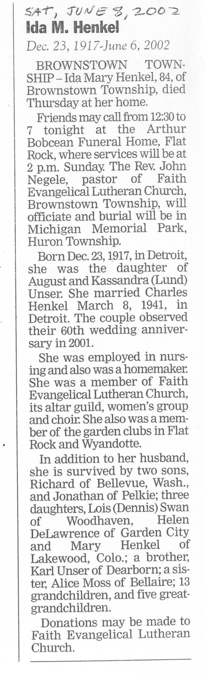 Obituary of Ida M. Henkel born Dec.23, 1917 in Detroit, Michigan. Resided in Brownstown Twp., Michigan.