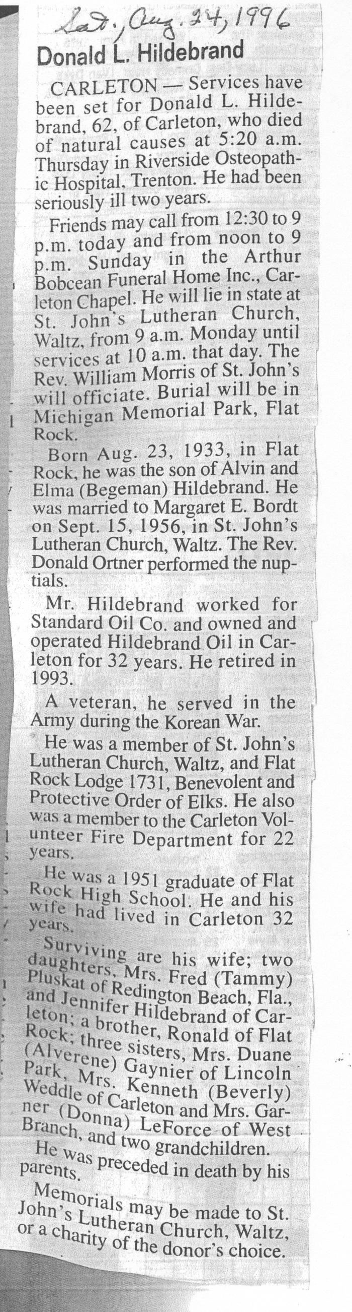 Obituary of Donald L. Hildebrand born Aug. 23, 1933 in Flat Rock, Michigan. Resided in Carleton, Michigan.