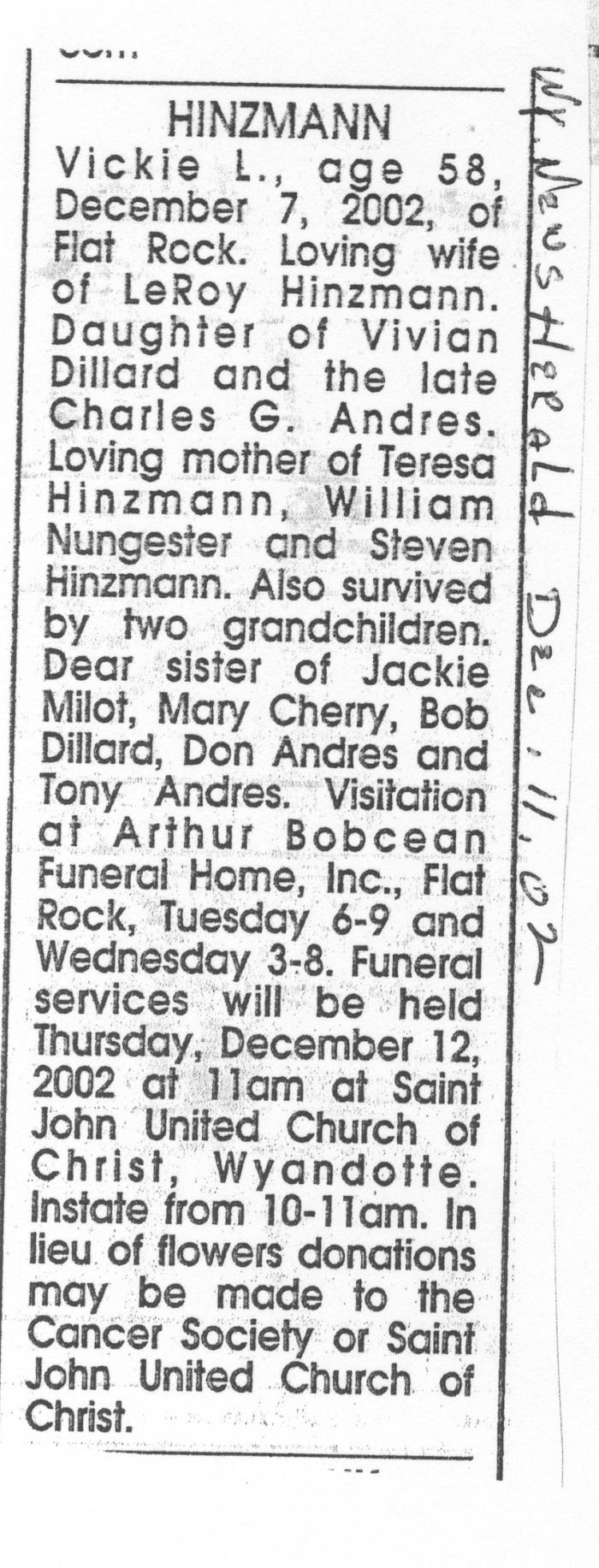 Obituary of Vicki L. Hinzmann. Resided in Flat Rock, Michigan.