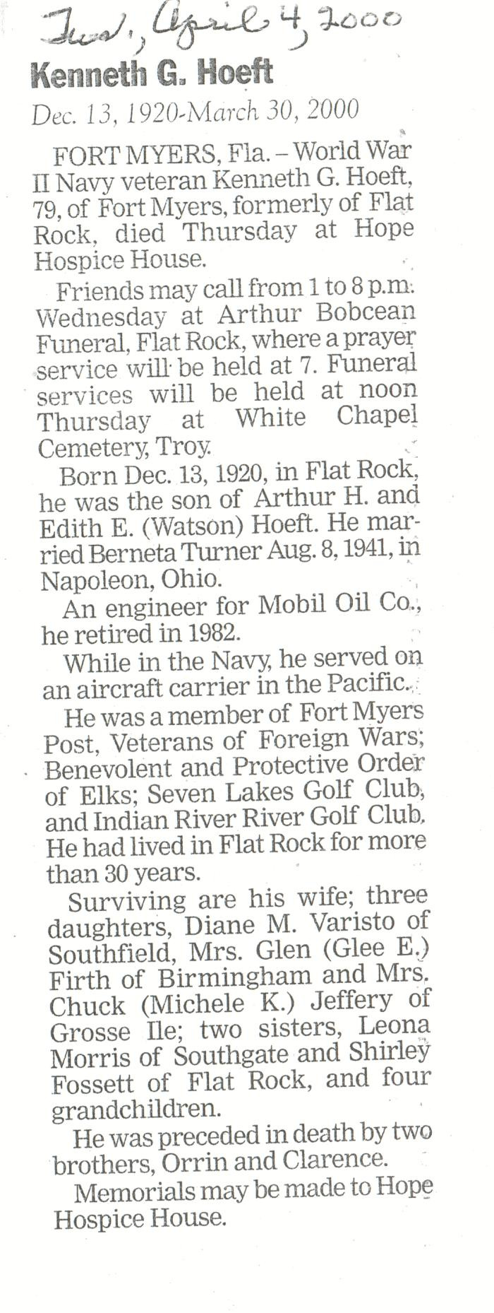 Obituary of Kenneth G. Hoeft born Dec. 13, 1920 in Flat Rock, Michigan. Resided in Flat Rock, Michigan and Fort Meyers, Florida.