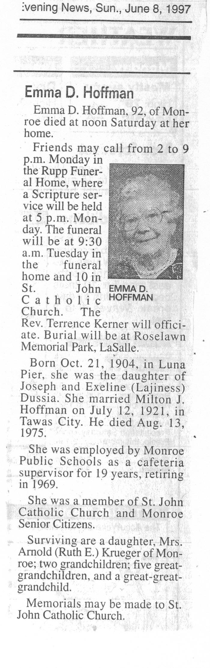 Obituary of Emma D. Hoffman born Oct.21, 1904 in Luna Pier, Michigan. Resided in Monroe, Michigan.