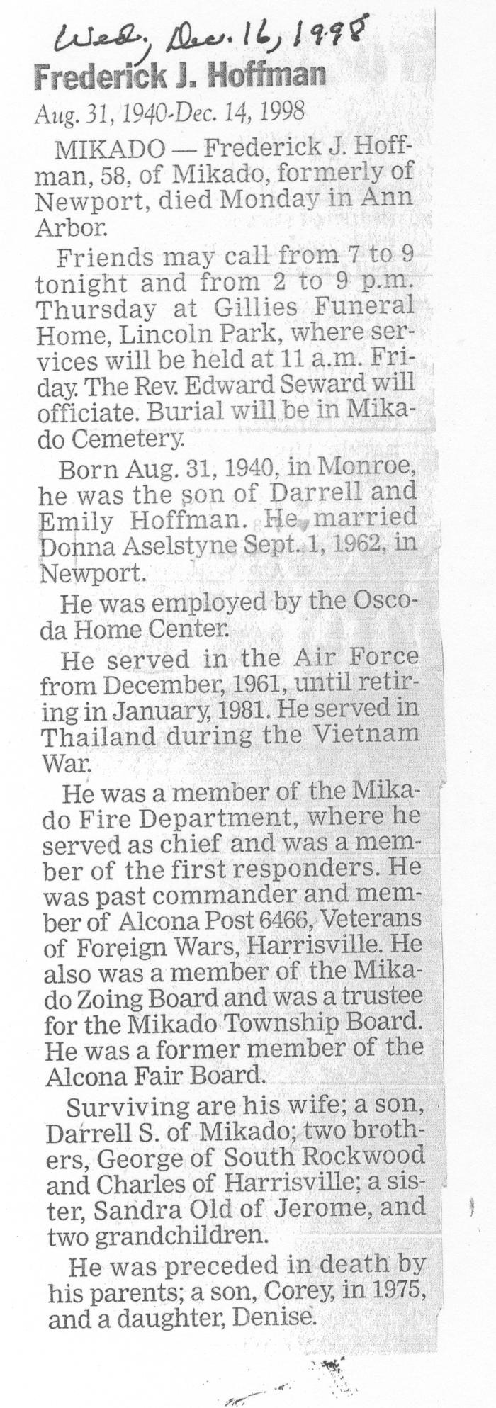 Obituary of Frederick J. Hoffman born Aug.31, 1940 in Monroe, Michigan. Resided in Newport, Michigan.