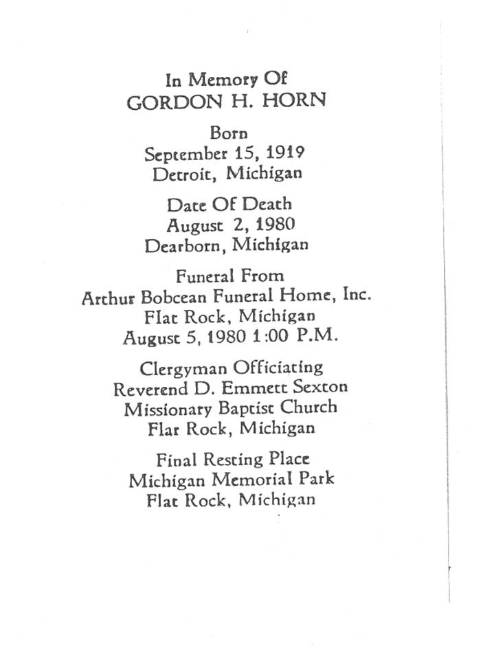 Obituary of Gordon H. Horn, born September 15, 1919 in Detroit, Michigan. Died in Dearborn, Michigan.