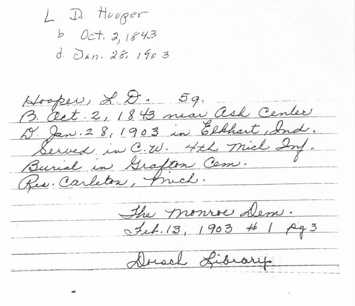 Obituary of L.D. Hooper, born October 2, 1943 near Ash Center, Michigan. Resided in Carleton, Michigan.