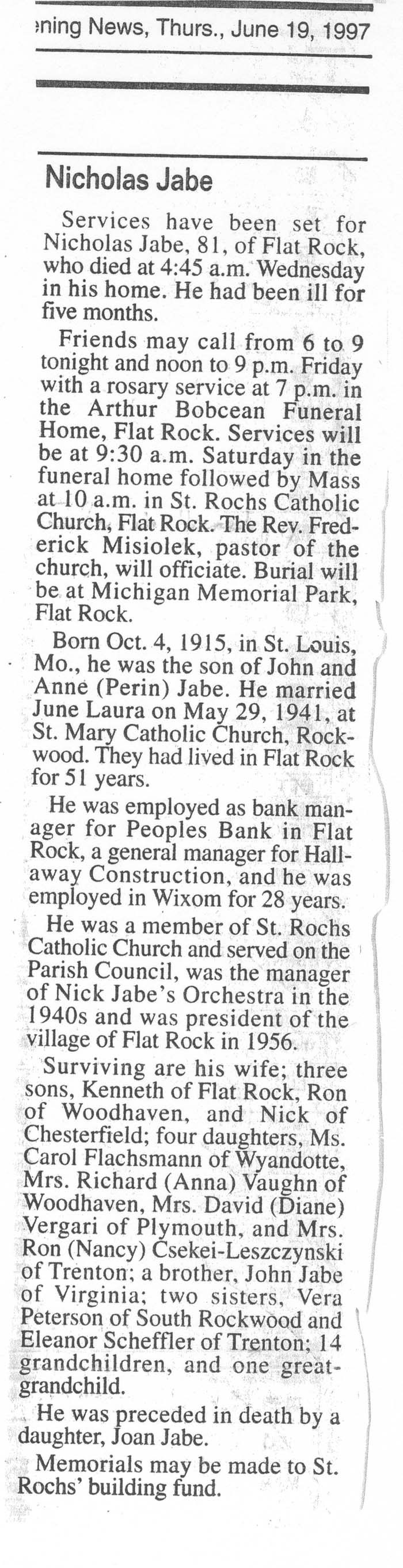 Obituary of Nicholas Jabe, born October 4, 1915 in St. Louis, Missouri. Resided in Flat Rock, Michigan.