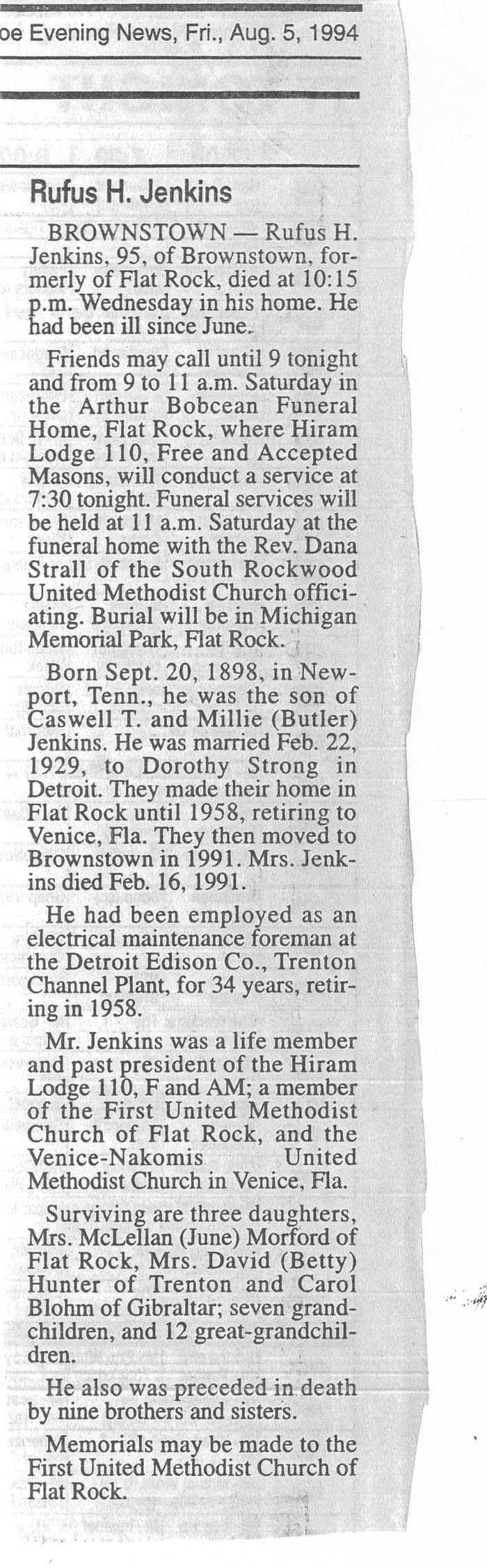 Obituary of Rufus H. Jenkins, born September 20, 1898 in Newport, Tennessee. Resided in Flat Rock, Michigan.
