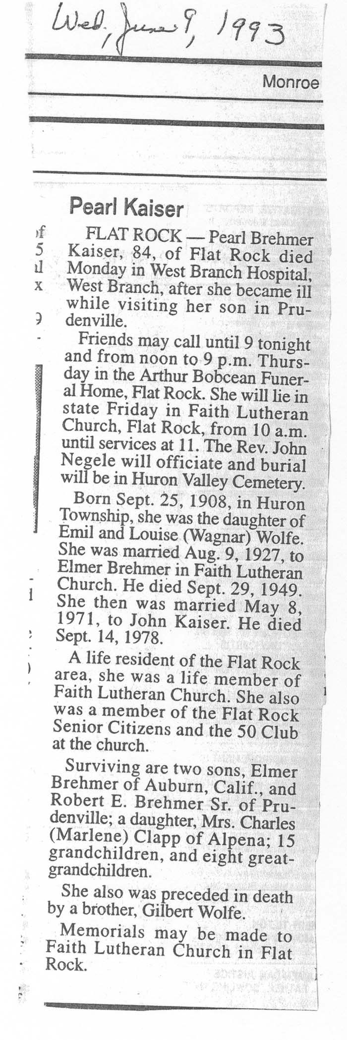 Obituary of Pearl Kaiser, born September 25, 1908 in Huron Township. Resided in Flat Rock, Michigan.