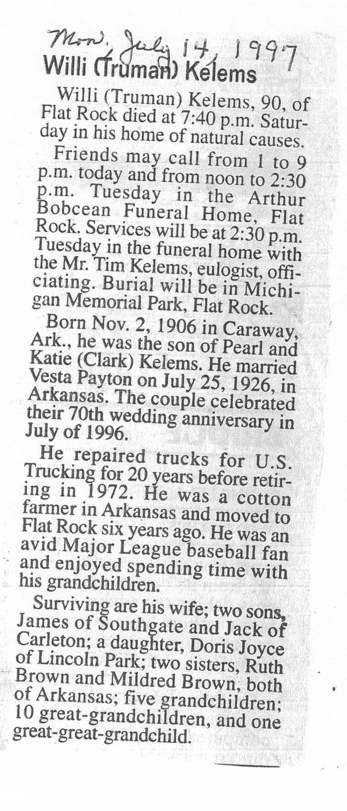 Obituary of Willi (Truman) Kelems, born November 2, 1906 in Caraway, Arkansas. Resided in Flat Rock, Michigan.