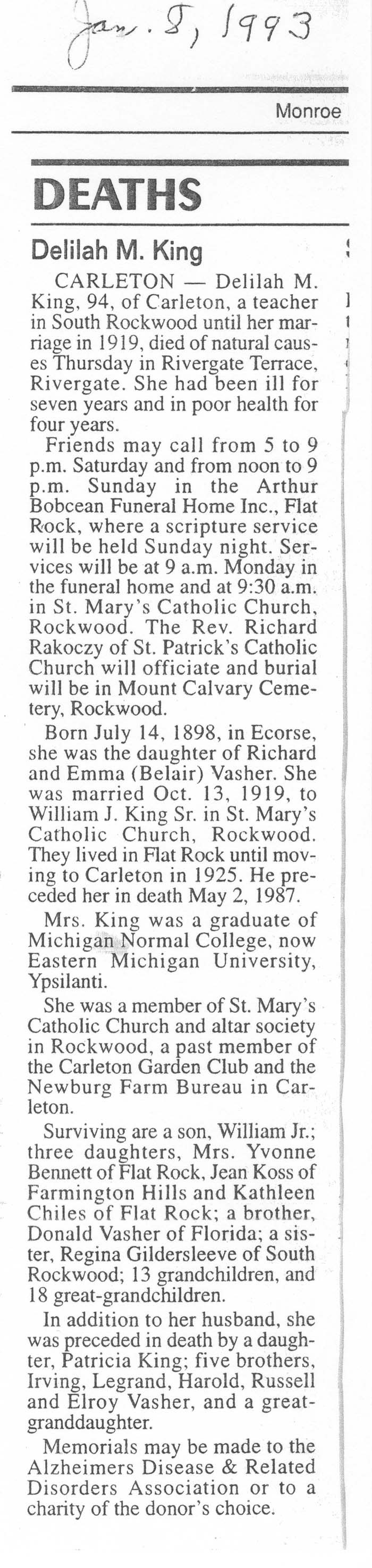 Obituary of Delilah M. King, born July 14, 1898 in Ecorse, Michigan. Resided in Flat Rock and later in Carleton, Michigan.