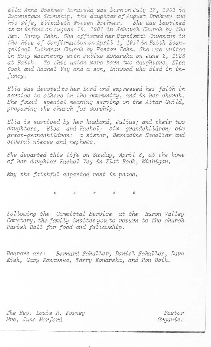 Obituary of Ella Anna Brehmer Konarska, born July 17, 1901 in Brownstown, Michigan. Resided in Brownstown, Michigan.