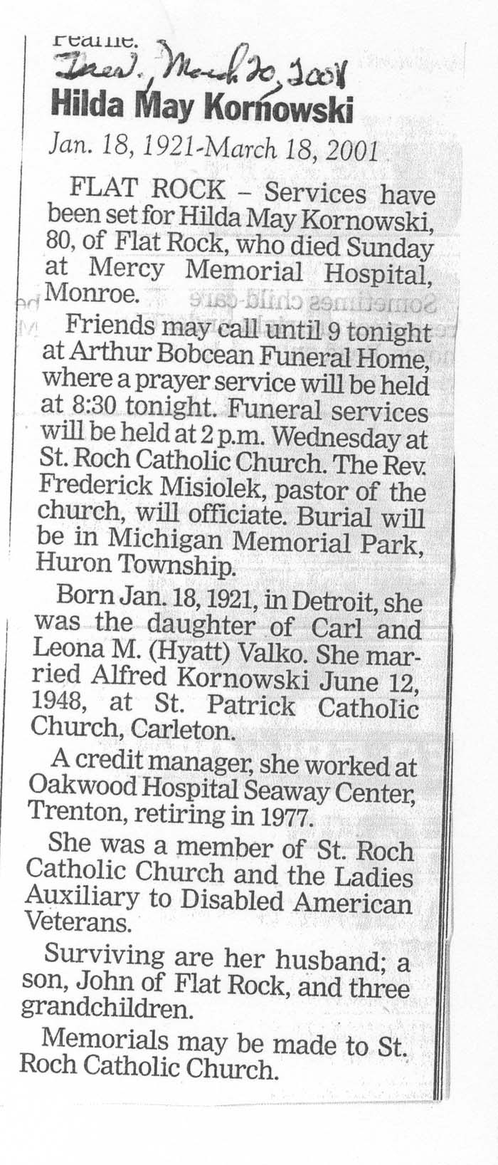 Obituary of Hilda May Kornowski, born January 18, 1921 in Detroit, Michigan. Resided in Flat Rock, Michigan.