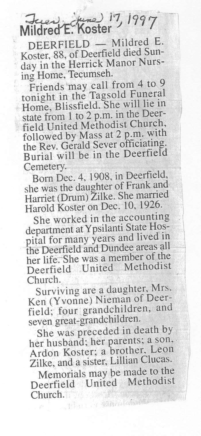 Obituary of Mildred E. Koster, born December 4, 1908 in Deerfield, Michigan. Resided in Deerfield, Michigan.