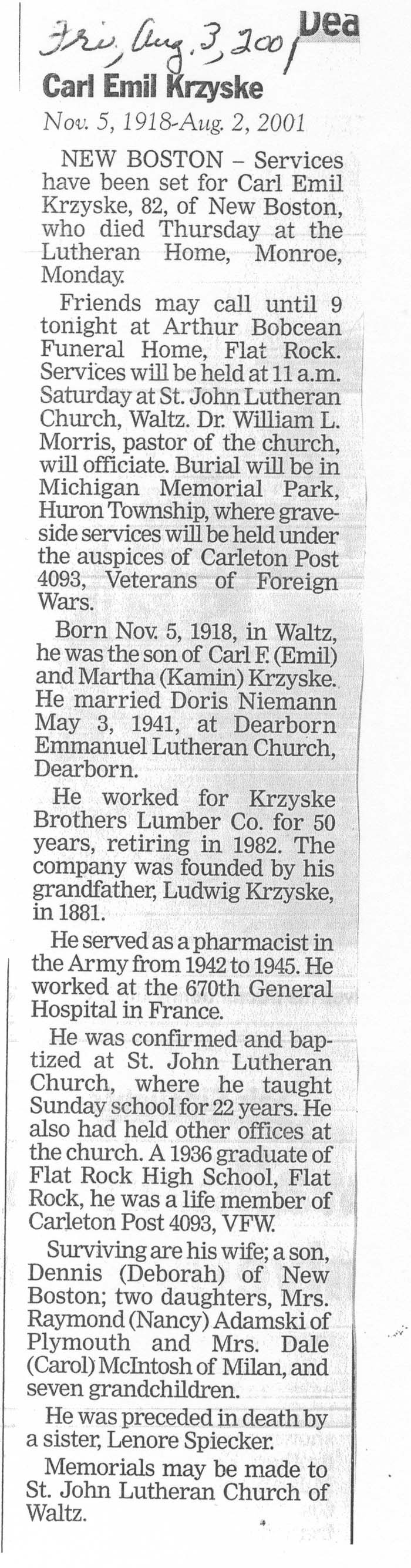 Obituary of Carl Emil Krzyske, born November 5, 1918 in Waltz, Michigan. Resided in New Boston, Michigan.