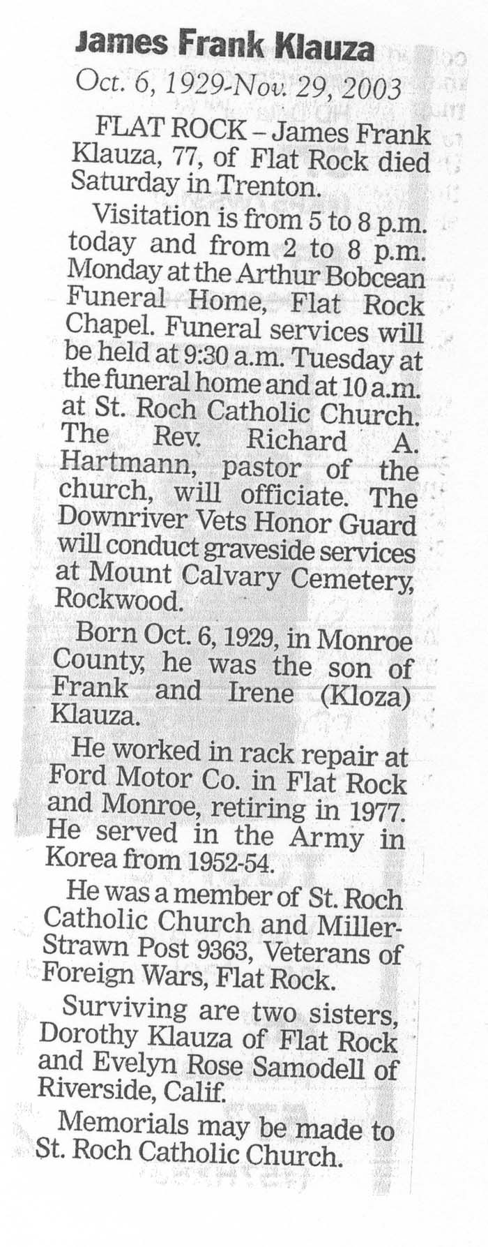 Obituary of James Frank Klauza, born October 6, 1929 in Monroe County, Michigan. Resided in Flat Rock, Michigan.