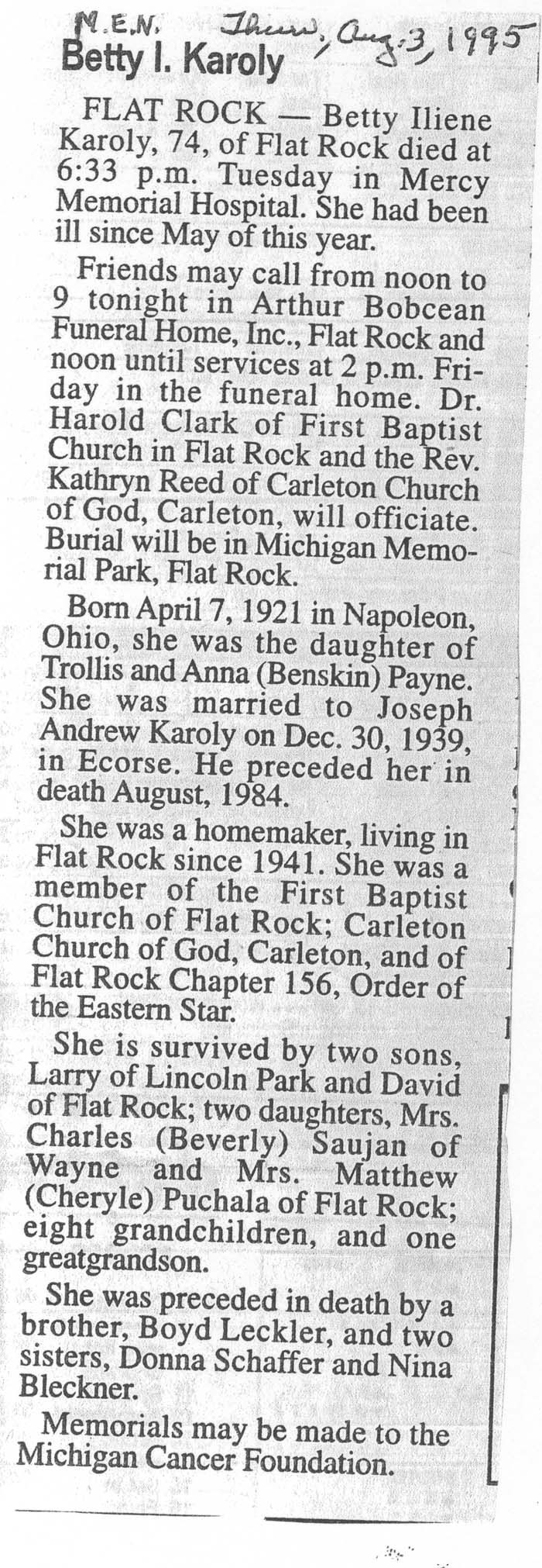 Obituary of Betty I. Karoly, born April 7, 1921 in Napoleon, Ohio. Resided in Flat Rock, Michigan.