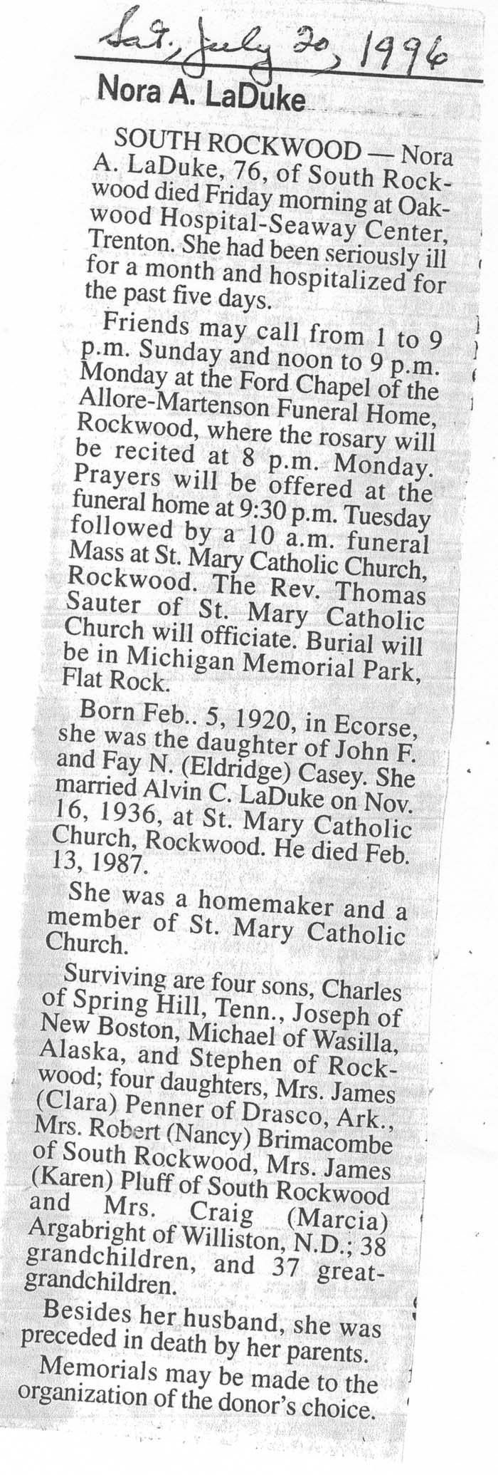 Obituary of Nora A. LaDuke, born February 5, 1920 in Ecorse, Michigan. Resided in South Rockwood, Michigan.