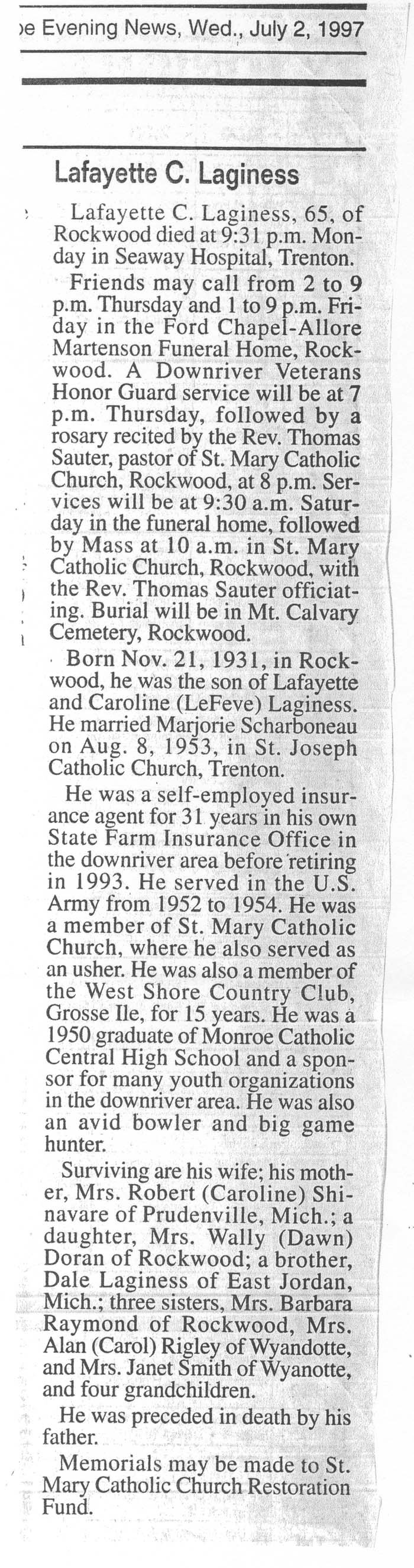 Obituary of Lafayette C. Laginess, born November 21, 1931 in Rockwood, Michigan. Resided in Rockwood, Michigan.
