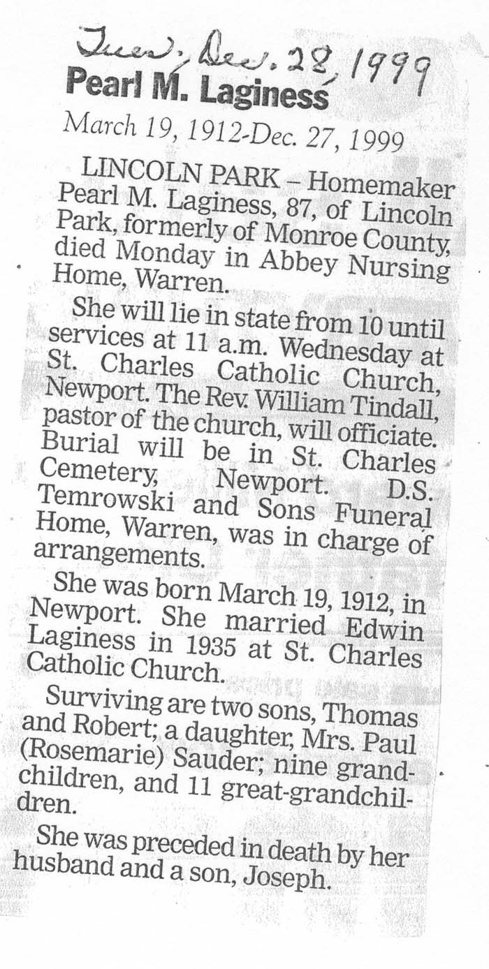 Obituary of Pearl M. Laginess, born March 19, 1912 in Newport, Michigan. Resided in Monroe County and later in Lincoln Park, Michigan.