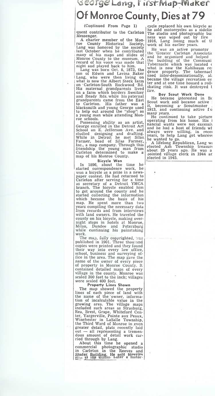 Obituary of George Lang born October 8, 1873. Died in 1952 in Monroe, Michigan.