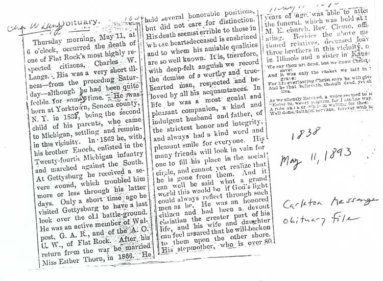 Obituary of Charles W. Langs, born in 1838 in Yorktown, New York. Died May 11, 1893 in Flat Rock, Michigan.