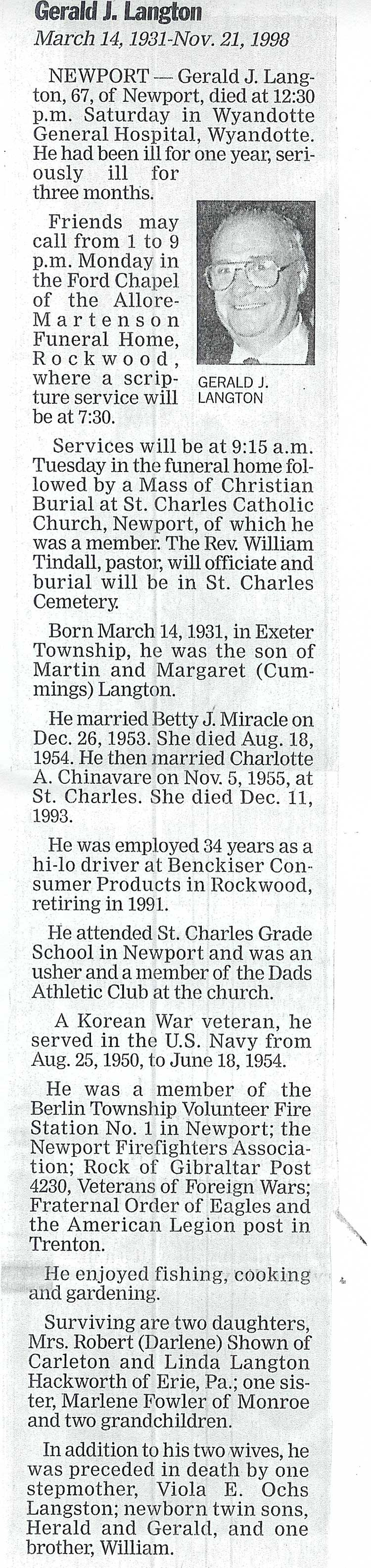 Obituary of Gerald Langton, born March 14, 1931. Resided in Newport, Michigan