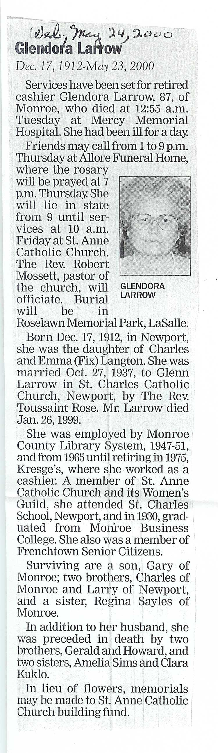 Obituary of Glendora Larrow. Died May 23,2000 in Monroe, Michigan. Resided in Monroe, Michigan.
