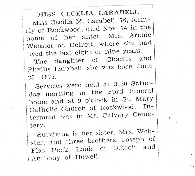 Obituary of Cecelia Larabell - Died Nov. 14 in Detroit. Formerly resided in Rockwood, Michigan.