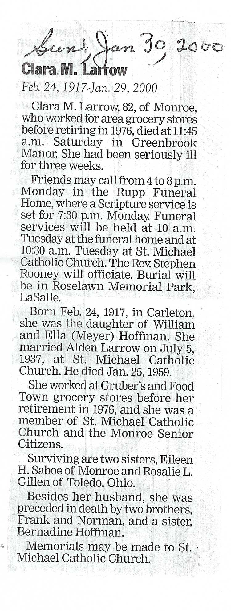 Obituary of Clara Larrow. Died Jan. 29, 2000. Resided in Monroe, Michigan.