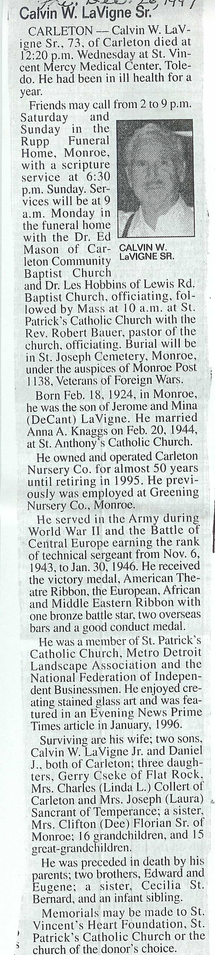 Obituary of Calvin LaVigne, Sr. Died Dec. 24, 1997 in Toledo, Ohio. Resided in Carleton, Michigan.