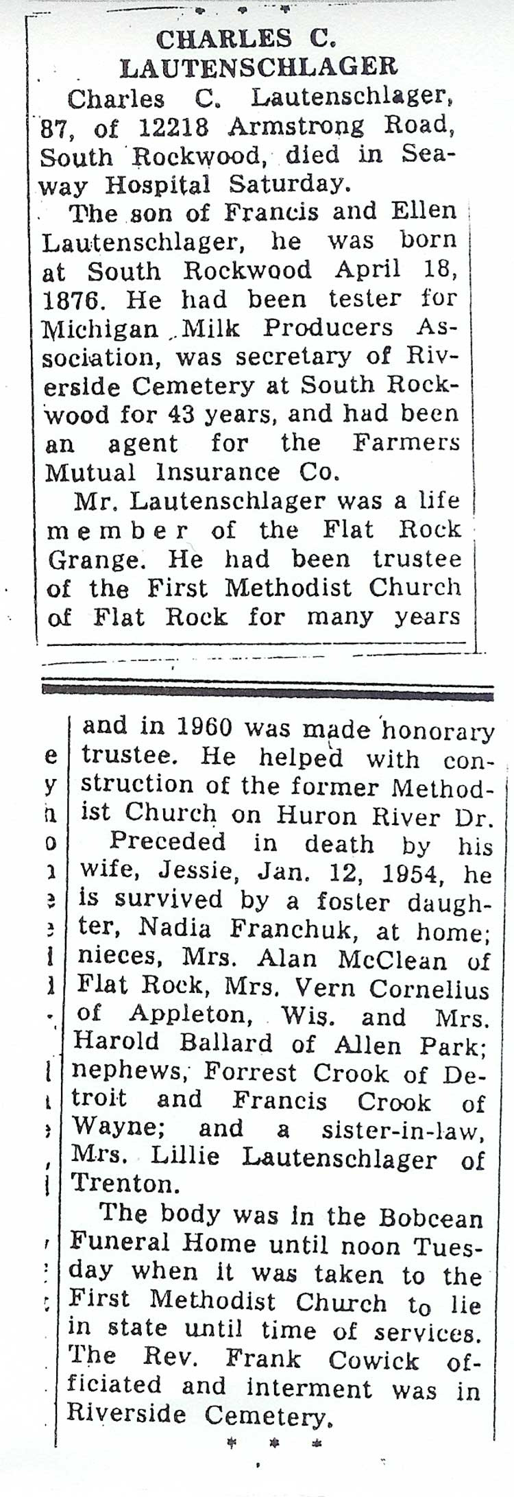 Obituary of Charles Lautenschlager. Died in 1963. Resided in South Rockwood, Michigan.