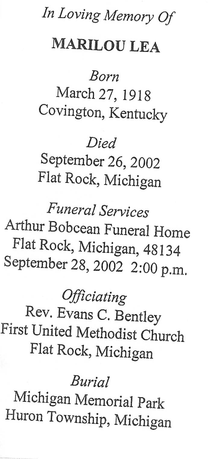 Obituary of Marilou Lea, born March 27, 1918 in Covington, Kentucky. Died in Flat Rock, Michigan.