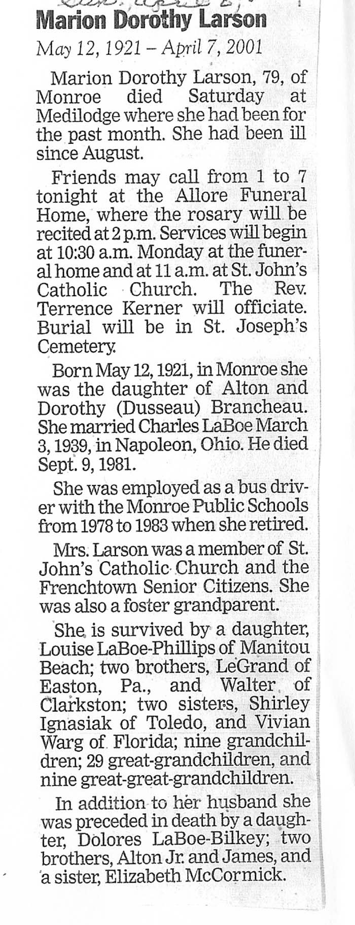Obituary of Marion Dorothy Larson, born May 12, 1921 in Monroe, Michigan. Resided in Monroe, Michigan.