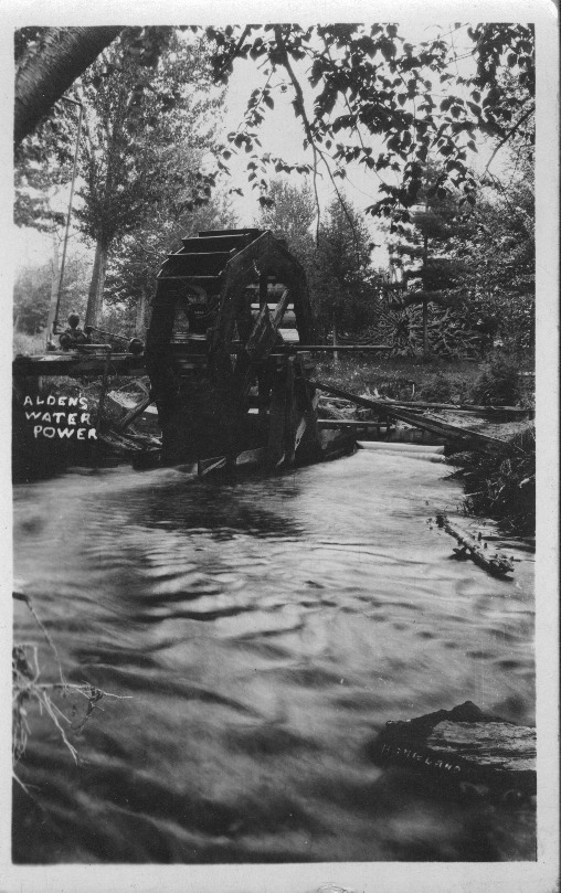 Black and white postcard of water wheel and gearing, Spencer Creek, Alden, Michigan, ca. 1910