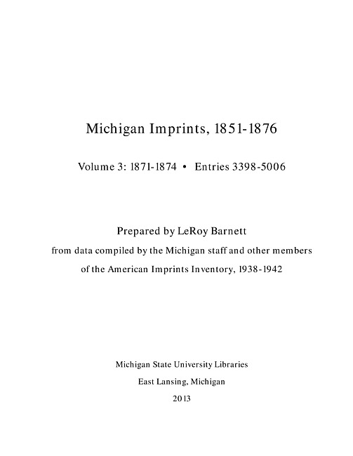 Michigan imprints, 1851-1876. Volume 3, 1871-1874, entries 3398-5006