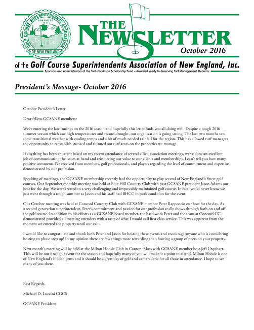 The newsletter of the Golf Course Superintendents Association of New England, Inc. (2016 October)