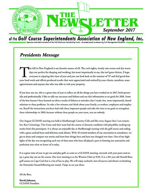 The newsletter of the Golf Course Superintendents Association of New England, Inc. (2017 September)