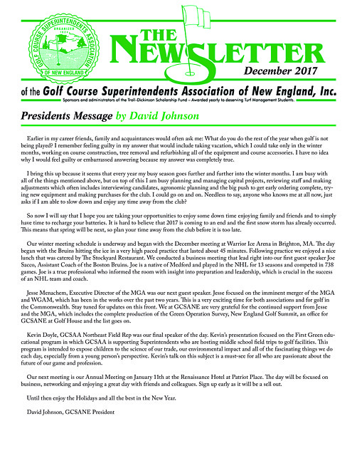The newsletter of the Golf Course Superintendents Association of New England, Inc. (2017 December)