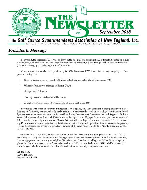 The newsletter of the Golf Course Superintendents Association of New England, Inc. (2018 September)